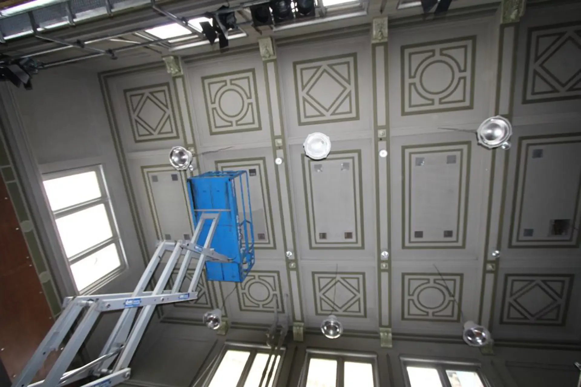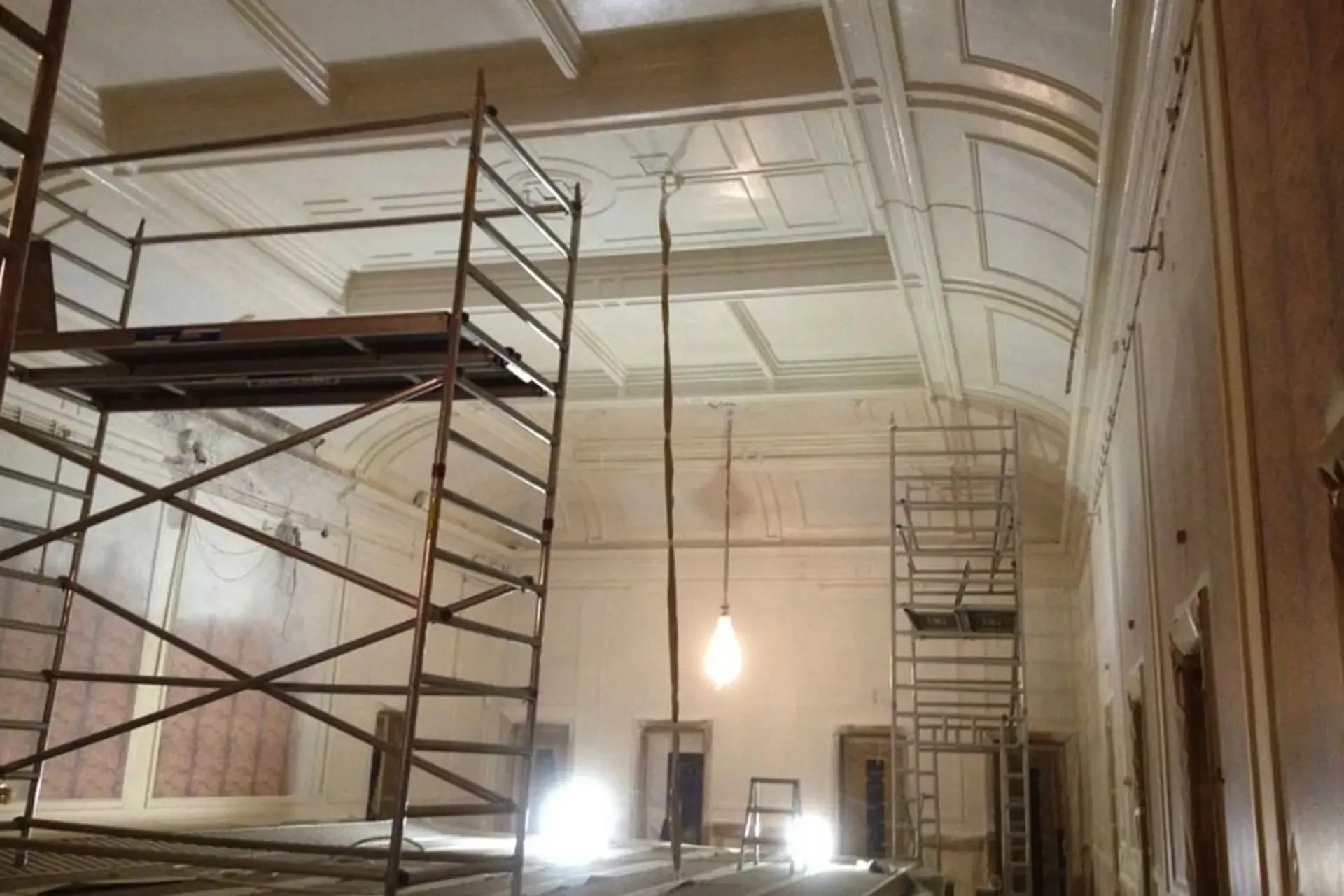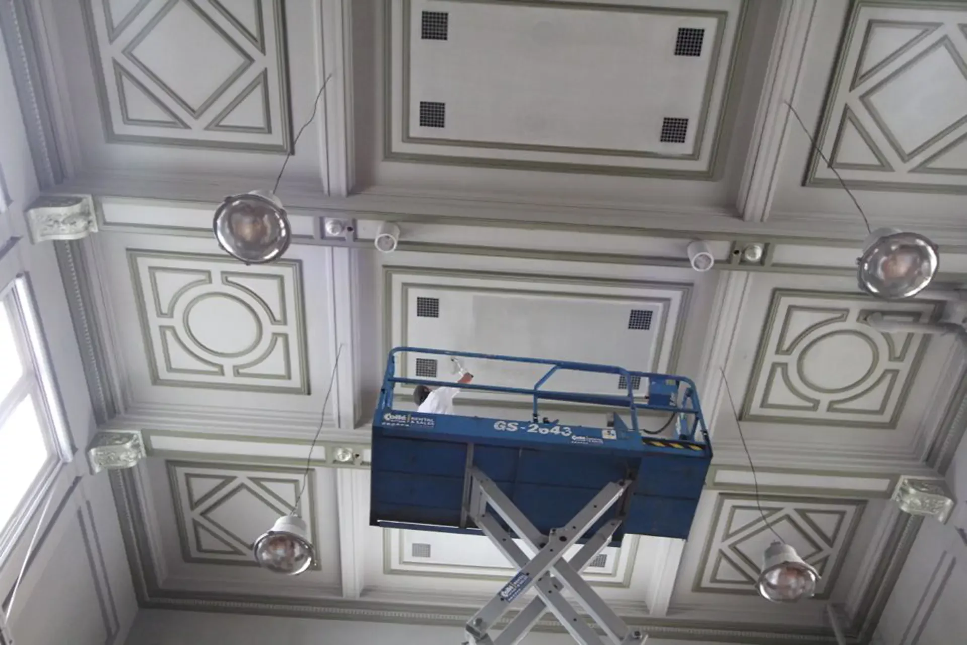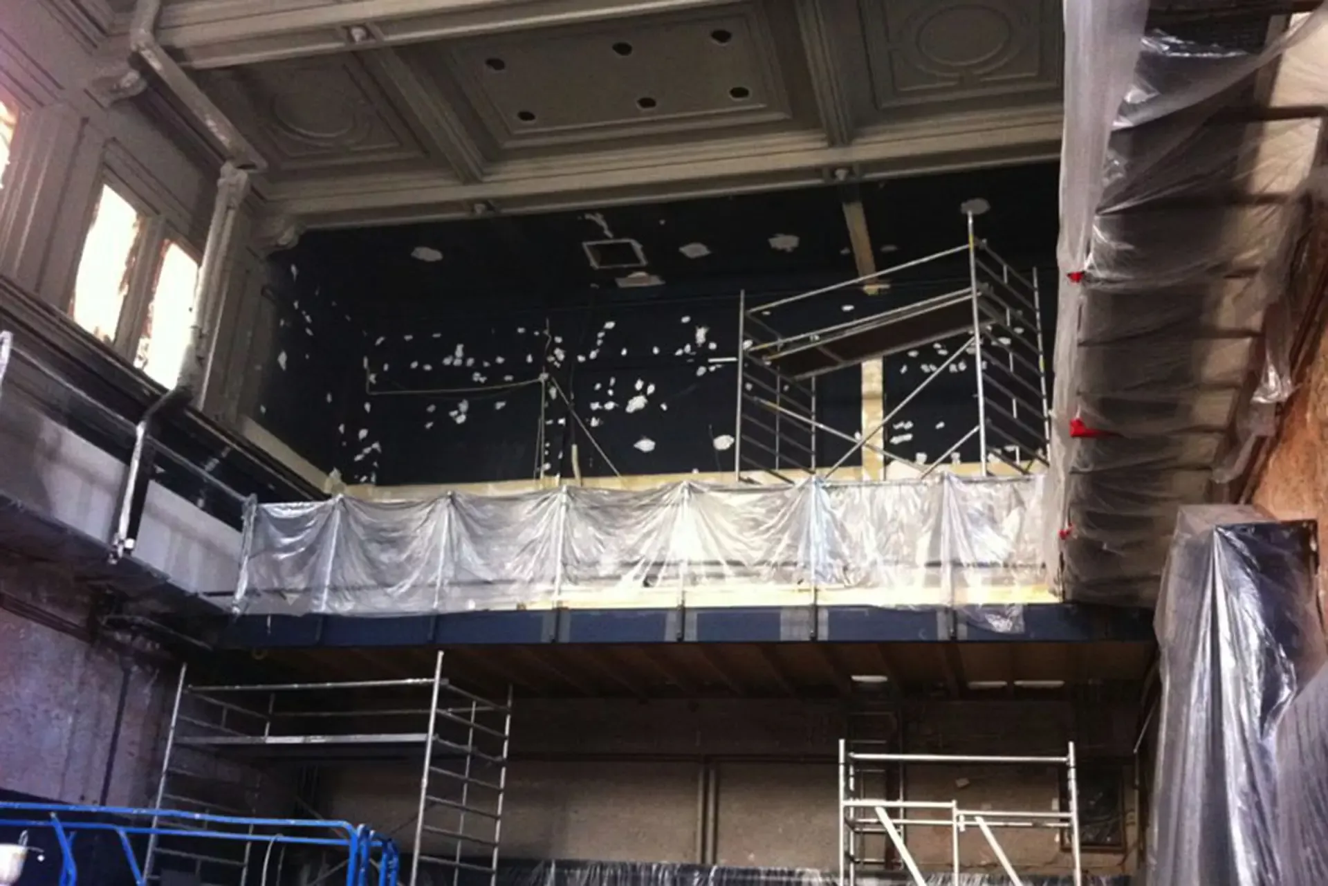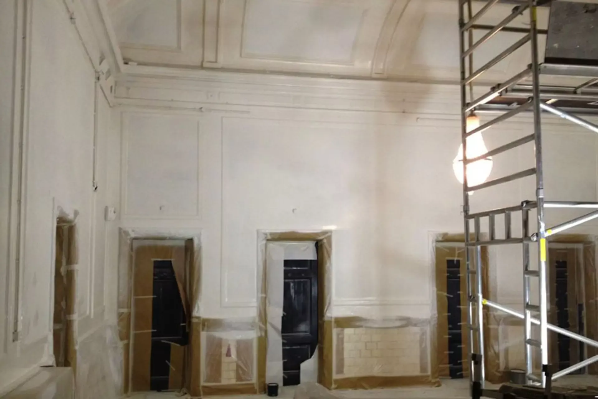 De Balie, gelegen aan het Leidseplein, is een icoon in Amsterdam. Recent hebben wij de renovatie voltooid van de Grote Zaal, Kleine Zaal, Bioscoop en het restaurant met foyer. Ondanks de strakke planning van maximaal één week per zaal, waarbij De Balie open bleef voor het publiek, hebben wij alle werkzaamheden nauwkeurig uitgevoerd. Na de nodige reparaties hebben we de wanden en plafonds zorgvuldig gespoten, terwijl de sierlijsten op de plafonds zijn afgewerkt met een subtiel contrasterende kleur, wat de ruimtes een elegante uitstraling geeft.